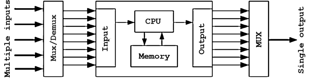 Neurotrons can have many 8-bit inputs (or 4-bit, 16-bit, etc.) but only one output that will be connected to several other neurotrons. The inputs are multiplexed to the size of the nanoprocessor’s input bus. The interconnection between neurotrons defines whether it will be a fixed or reconfigurable network. Below is an example of a Fixed Neurotronic Network (RNF).