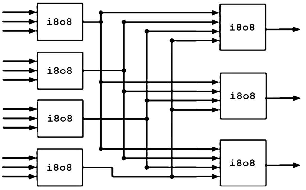A neurotron has a data input of 8, 16, 32, or more bits, multiplexed into just one line. Its output is normally connected to several other neurotrons. Activators and inhibitors are encoded on the same line, and the nanoprocessor will identify them and respond with the appropriate output. Below is an illustration of a neurotron with 8 input bits and 8 output bits. By convention, let’s say that this neurotron is of type “i8o8,” which means “input, 8-bit, output, 8-bit.”